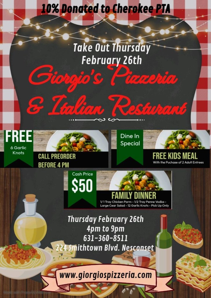 On February 26th (take out Thursday) 10% of sales will be donated to the Cherokee Street PTA. Come show your support!